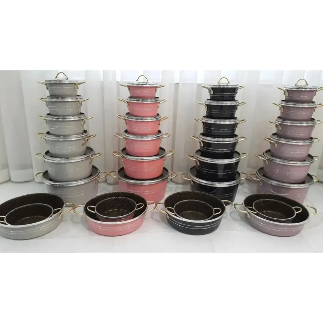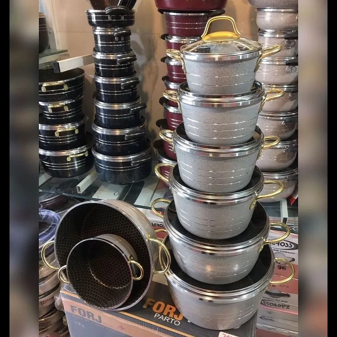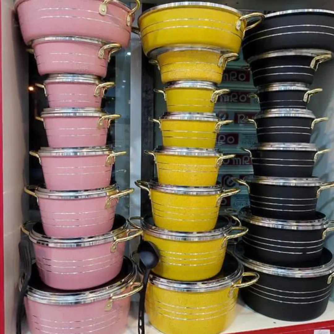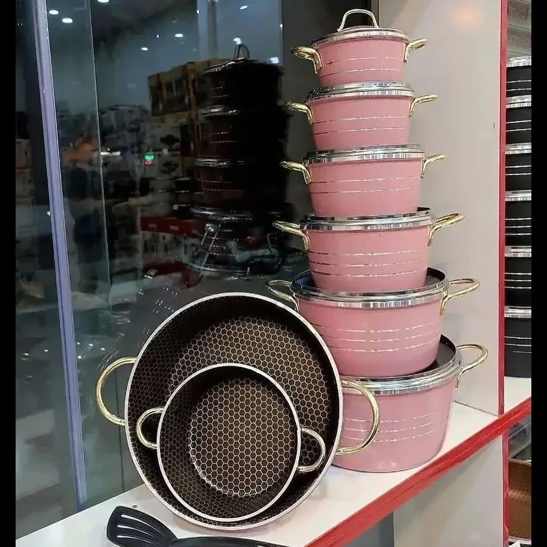 سرویس قابلمه 14 پارچه طرح چدن شامل 6 قابلمه با ضخامت 2.5 میل، موجود در رنگ مشکی و طوسی و صورتی. سایز قابلمه ها 28، 24، 20، 18، 16 و 14 و سایز تابه ها 28 و 18.