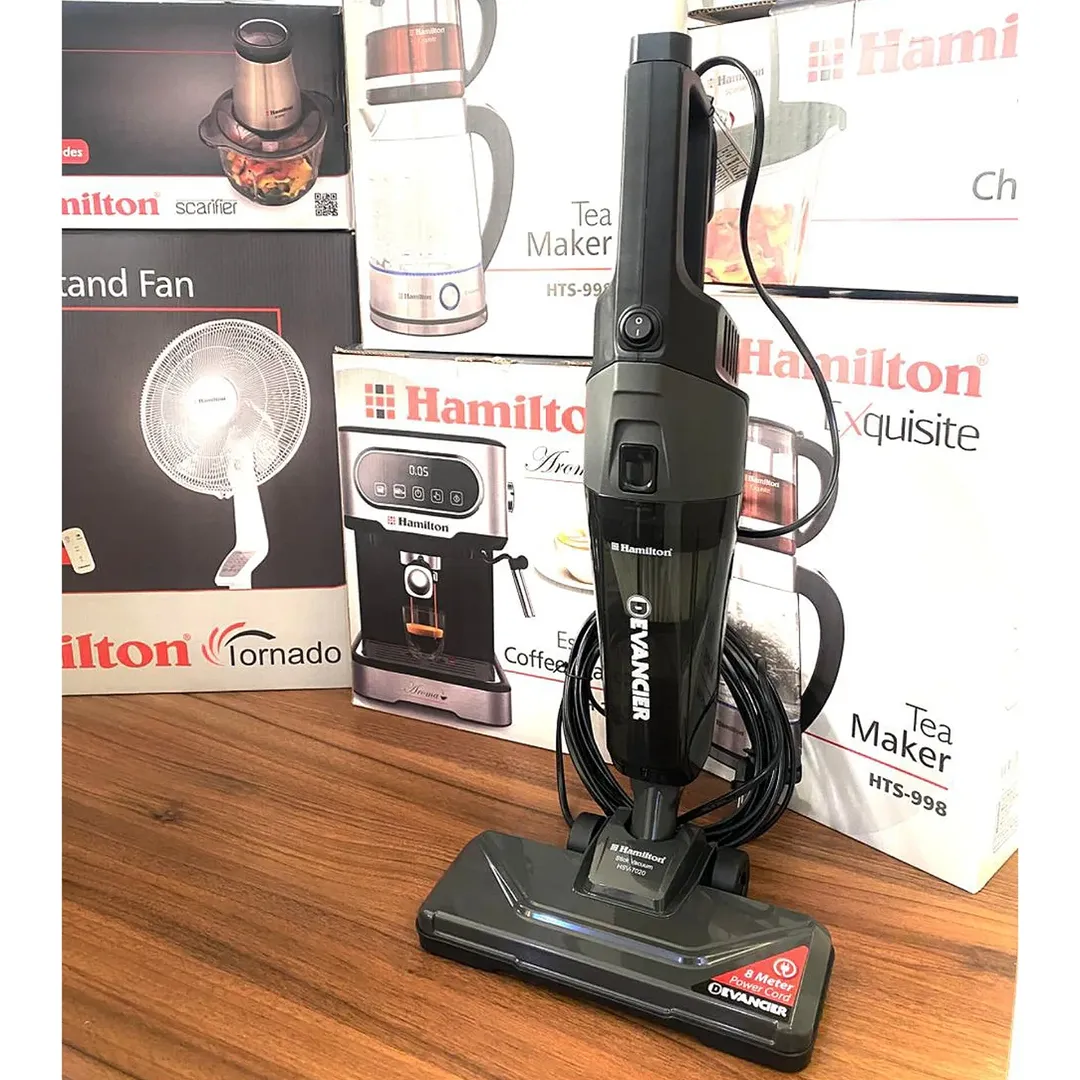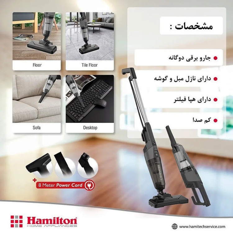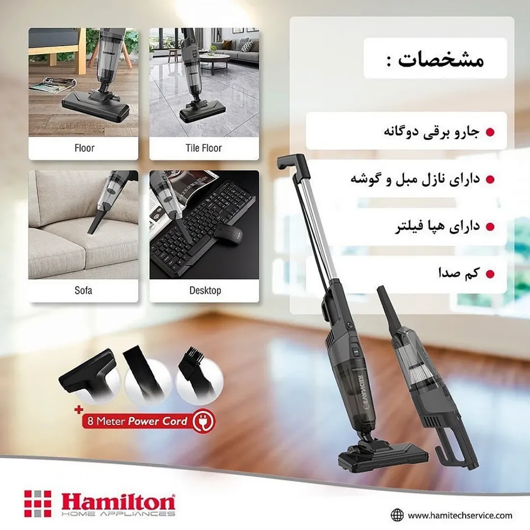 جارو پرتابل همیلتون وزنش خیلی سبکه مناسب استفاده روزانه نه خسته میشی نه دستت درد میگیره دارای دستگیره ارگونومیک توان مصرفی : دارای سیم ۸ متری دارای قابلیت دسته کوتاه و بلند دارای قابلیت چرخش ۱۲۰ درجه نوع موتور : ac تمام مسی تعداد سری ها :سری مخصوص کف ، سری مخصوص گوشه ها